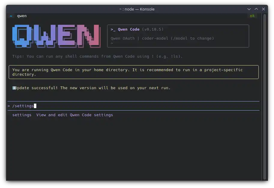 Qwen CLI has many settings, all of which can be viewed here. To go to the settings, enter in the console: