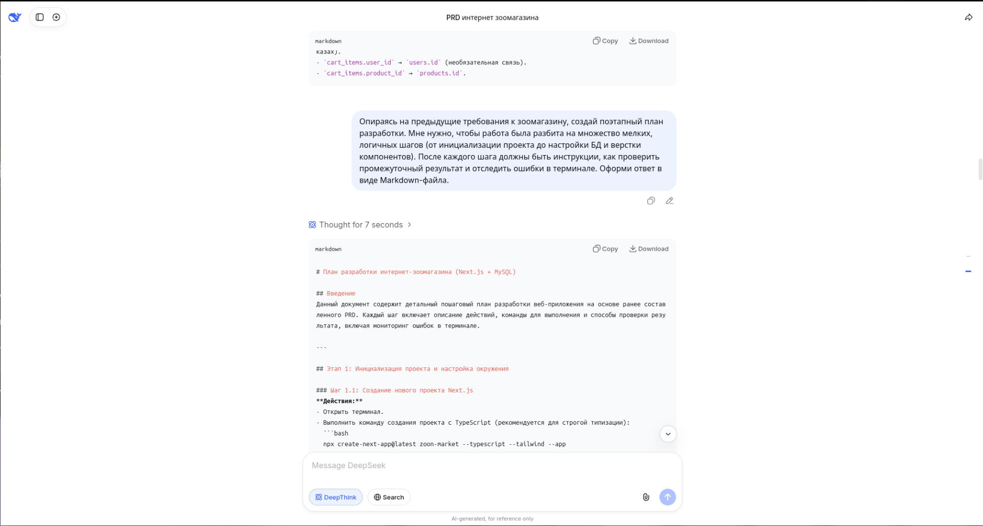 To create an application, we need requirements. We don't want to write them ourselves, so we delegate this task to a neural network. Any top 5 model will do, but in this example, I'm using DeepSeek to generate md-files.